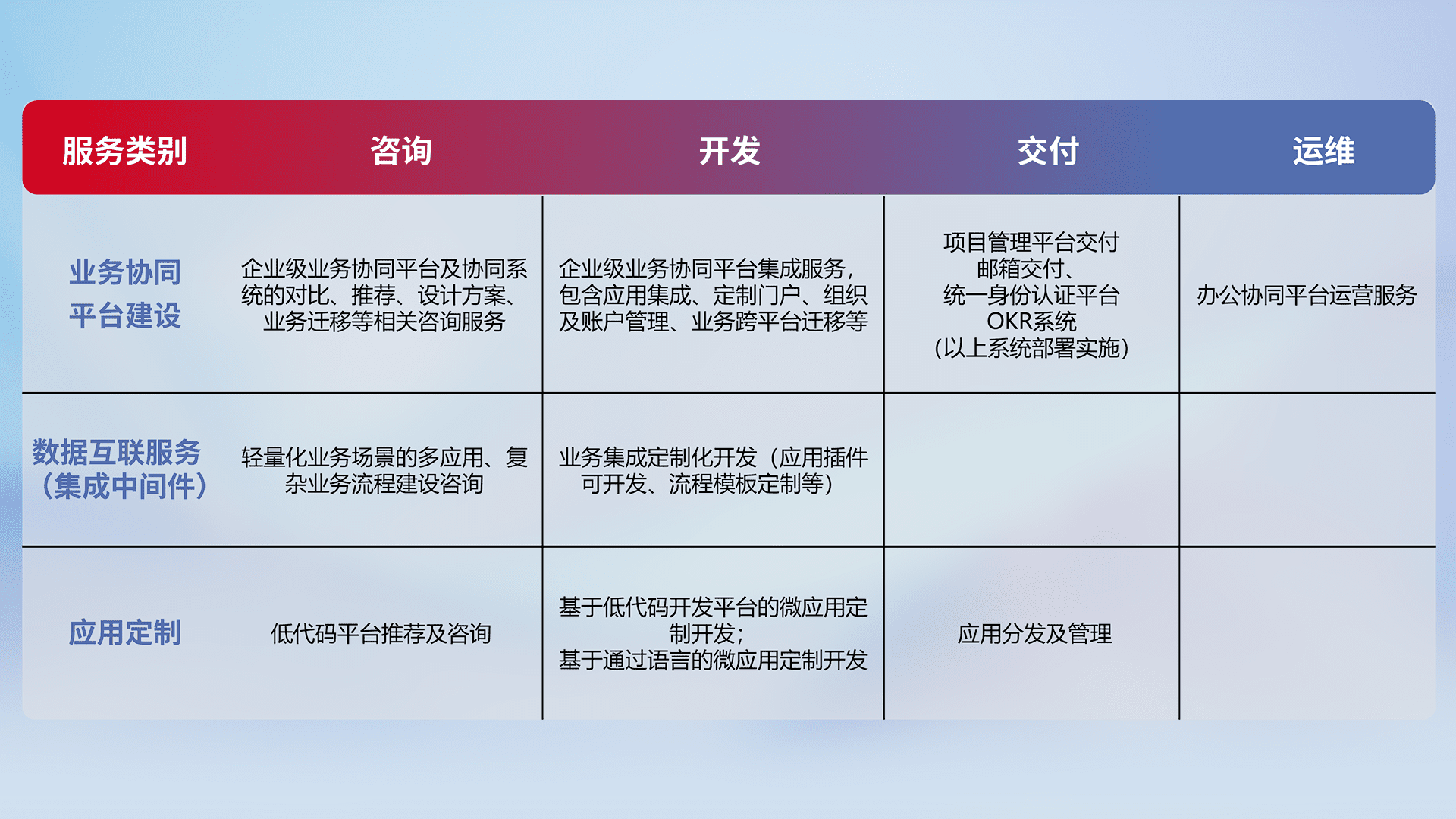 针对钉钉、、、、企微、、、IDaas等平台级产品提供产品的规划、、、方案、、、交付、、、、定制化开发等服务,,,,实现如统一协同办公、、智能客户服务、、混合会议管理、、、智能数据查询、、、、等业务场景,,,实现数字化转型。。。。