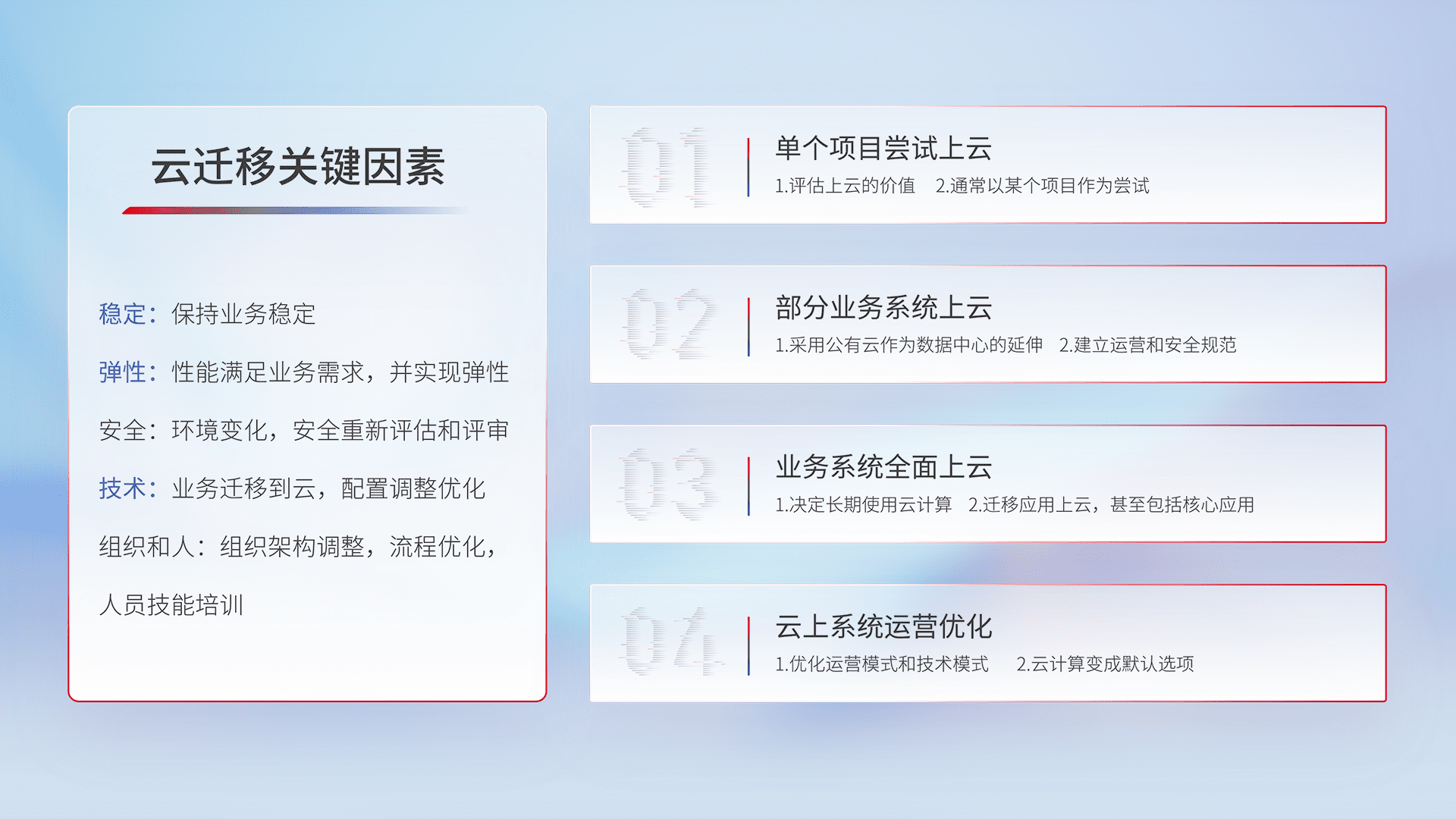 结合实际业务,,,从规划设计、、、、云平台选型、、云原生改造、、、数据迁移、、集成交付,,迁移全过程为客户识别最佳上云路径,,,做好风险识别管理,,,设计网络架构、、、、身份权限、、、、安全审计合规、、、操作审计、、日志审计、、、监控告警策略、、、多站点容灾设计等,,,对云上基础设施进行整体规划,,提升IT治理水平,,,,以满足弹性、、、高可用、、高性能的需求。。