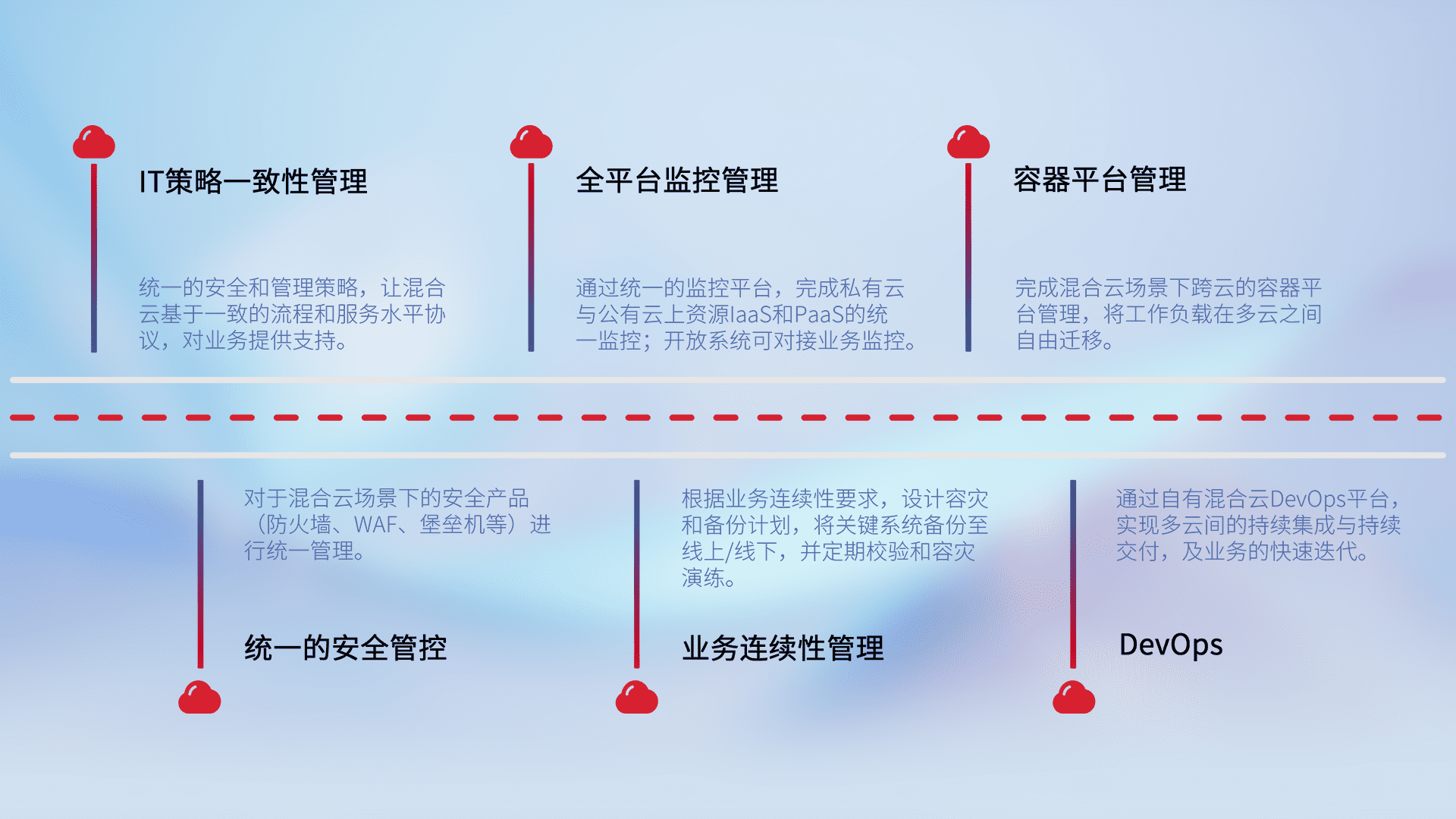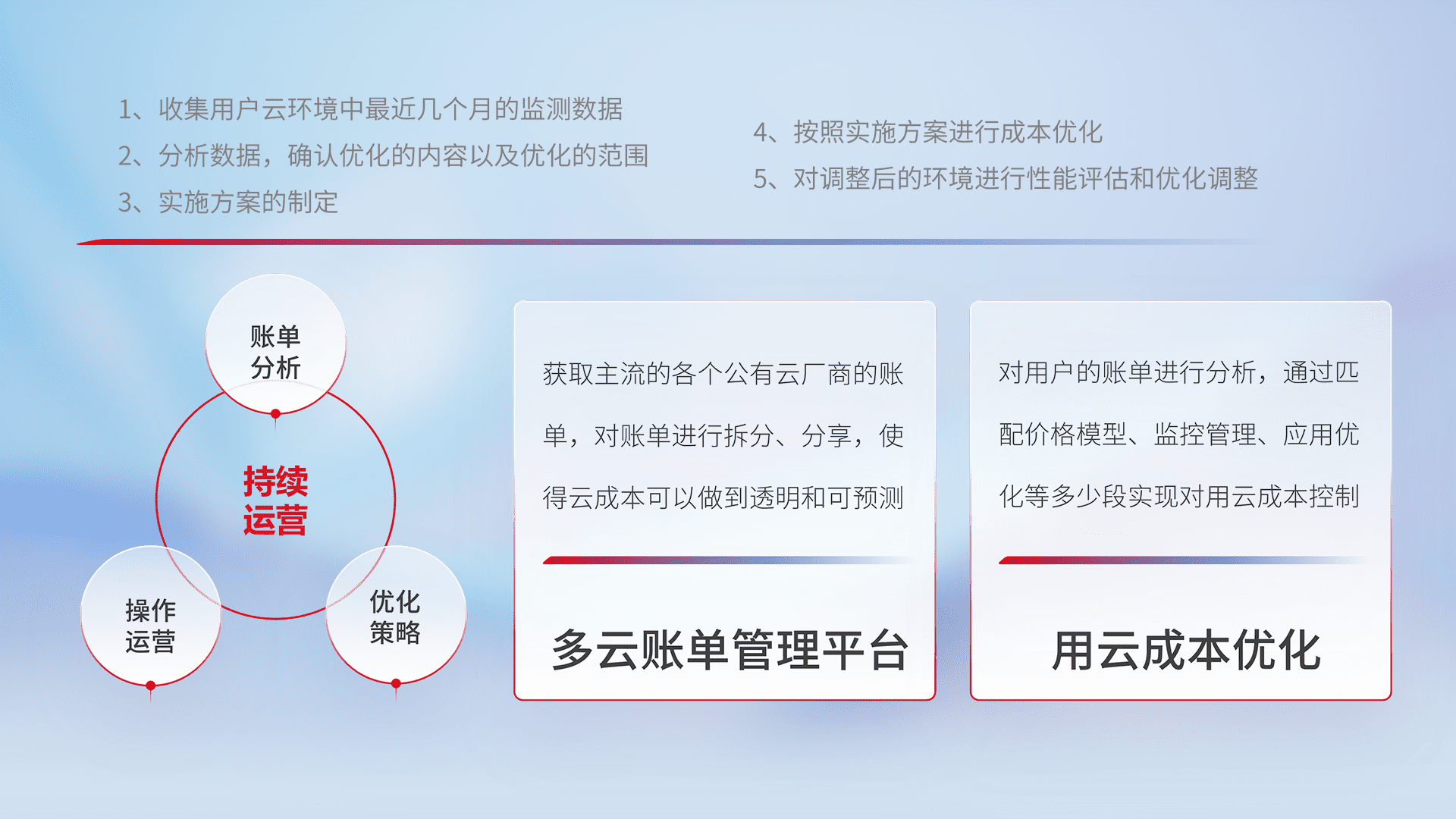 通过多云纳管,,,,以统一的资源数据模型把客户的云资源进行抽象和封装,,,进而实现对多云资源的统一操作,,保障云资源管理的可靠性、、、、稳定性与可用性。。。。量身定制化运维内容,,配置、、开发运维、、、补丁管理、、、、备份、、、监控、、、、认证和访问管理、、、审计和日常巡检等,,,,保障在用云过程中的可靠度,,,,稳定度以及高可用率。。